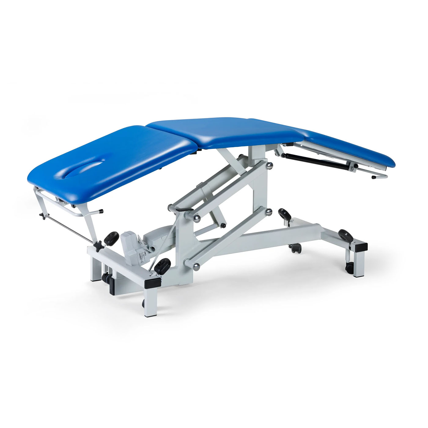 Available with either hydraulic or electric height adjustment, the three-section physiotherapy couch allows smooth, effortless positioning to suit both patient comfort and practitioner ergonomics. Its multi-section design provides greater flexibility, with a manually adjustable backrest and leg section, enabling patients to be comfortably supported in sitting, prone, or supine positions. This versatility makes it well suited for a wide range of treatments and clinical procedures.